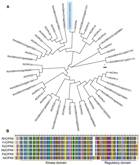 Phylogenetic analysis and sequence alignment of RhCIPK6. (A) Phylogenetic tree analysis of putative rose CIPK proteins with 26 CIPK proteins from Arabidopsis. (B) Multiple sequence alignment of CIPK6 proteins from different species. Conserved domains are represented below the alignment. At, Arabidopsis thaliana; Fv, Fragaria vesca; Pp, Prunus persica; Md, Malus domestica; Pa, Prunus armeniaca.