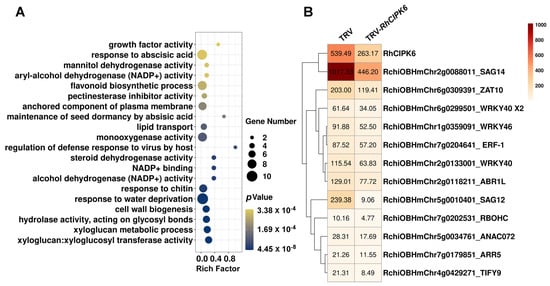 Analysis of differentially expressed genes in RhCIPK6-silenced petals. (A) GO biological process enrichment of DEGs in TRV-RhCIPK6 petals compared with TRV control petals. Vertical axis indicates GO terms and abscissa represents the rich factor. The q value indicates significance of the rich factor. Size of dots indicates number of genes in the GO term. (B) Expression profile of screened genes identified in TRV-RhCIPK6 petals compared with TRV control petals.