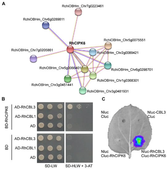 Identification of interacting protein of RhCIPK6. (A) Prediction RhCIPK6 protein–protein interaction network constructed using STRING database. PPI network of top 10 hub genes via information of STRING protein query with confidence score ≥ 0.7. Network nodes represent proteins. Edges indicate both functional and physical protein associations. (B) Results of yeast two-hybrid assay between RhCIPK6 and RhCBL1/3. CBL1/3 were fused to the GAL4-activating domain (AD) and RhCIPK6 was fused to the GAL4 DNA-binding domain (BD). (C) Interaction of RhCIPK6 and RhCBL3 as tested by the split-luciferase complementation assay in N. benthamiana. RhCIPK6 and RhCBL3 were constructed in cLUC and nLUC vectors, respectively. Empty constructs were used as negative controls.
