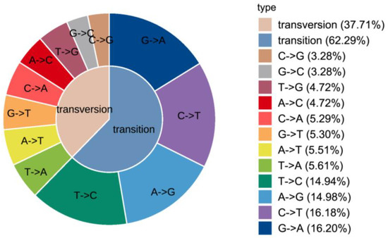 According to our previous study [23], the experimental results of transcriptome sequencing of mixed tissues of black porgy with different growth rates showed that 3104 genes were distinguished to be significantly differentially expressed (FDR < 0.05 and |log2FC| > 1), of which, 1129 were up-regulated and 1975 were down-regulated genes. Based on the DEGs in the transcriptome and the whole genome sequence of the black porgy as a reference, GATK software 4.0 was used to detect the mutation of SNPs and Indels. A total of 572,598 SNP sites were detected. Data with base quality values lower than Q30 were removed and 109,719 high-accuracy black porgy SNP sites were screened. Among them, transition type SNPs accounted for 62.29% of the total sites, including G→A, C→T, A→G and T→C; transversion type SNPs accounted for 37.71% of the total sites, including C→G, G→ C, T→G, A→C, C→A, G→T, A→T and T→A (Figure 1). Based on the following filtering conditions: (1) the quality of the mutated base Q ≥ 900, (2) the difference between the number of reference reads and the number of mutated reads is ten times or more, (3) the mutated base belongs to a sense mutation, a total of 61 SNPs were selected for genotyping in this experiment. The primer information is shown in Supplementary Table S1.