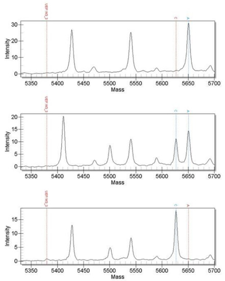 Sangon Bioengineering Co., Ltd. (Shanghai, China) was entrusted to perform genotyping of candidate SNP loci by MALDI-TOF MS. MALDI-TOF MS is a representative of medium-throughput SNP genotyping technology. It has the characteristics of high sensitivity, rapid analysis, easy to analyze spectra and small sample consumption. It is a powerful analytical tool in the field of molecular biology [25,26]. MALDI-TOF MS is based on the “primer extension method”, which extends a base on the SNP site to be detected, and then is excited by instantaneous nanosecond (10−9 s) intense laser light and separated according to mass-to-charge ratio in a non-electric field drift region. Different genotypes can be distinguished according to the quality of the extended bases, which fly in the vacuum tube and arrive at the detector at different times [27].