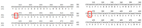 DNAMAN software 9.0 has been used to predict the amino acid sequences of the four SNPs developed from this research. The results show that scaffold13-4787950 was located at the 364th base from the 5’ end of the cDNA chain of cytochrome P450 3A (CYP3A40) and the base mutation type was A/C. Before mutation, the codon corresponding to this site was AAC and the translated amino acid was aspartic acid. The codon corresponding to this site was CAC after mutation and the translated amino acid becomes histidine (Figure 5). scaffold2-13687576 was located at the 6070th base of the cDNA strand from the 5’ end of the complement component 4 gene (C4). Before the mutation, the corresponding codon of this site was AAC. After the mutation, the corresponding codon was UAC. The resulting amino acid was changed from aspartic acid to tyrosine (Figure 6). Scaffold290-11890 was located at the 757th base on the fibrinogen beta chain (FGB). Before the mutation, the corresponding codon of this site was UUC, after the mutation, the corresponding codon was CUC. The translated amino acid was changed from phenylalanine was to leucine (Figure 7).