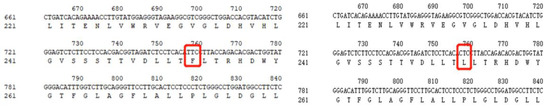 Changes in amino acid species with the base mutation before and after at scaffold290-11890. F is phenylalanine and L is leucine □ as shown in the figure.