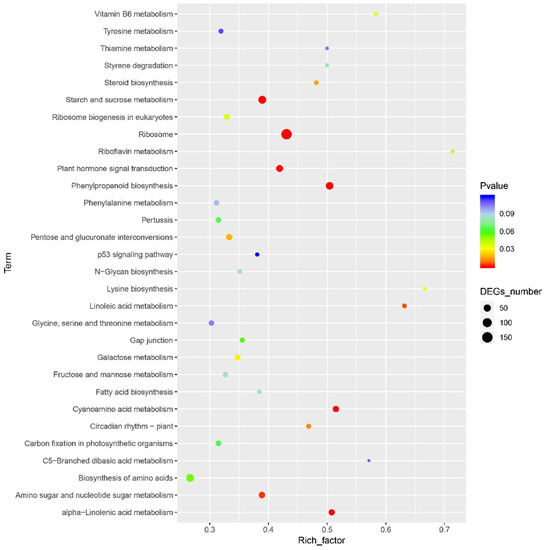Enrichment of KEGG. The horizontal axis represents the enrichment factor, that is, the ratio of the number of differential genes enriched to a certain KEGG term to the number of background genes obtained by sequencing. The ordinate represents the function enriched in this KEGG term: the larger the circle, the more differential genes enriched in this function. The color spectrum from blue to red represents the uncorrected p-value.
