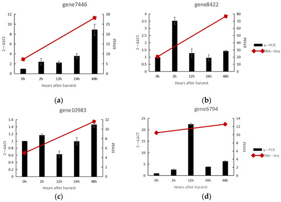 Both groups of genes fall under the OMT group and most commonly share the AdoMet MTases domain. However, COMT has a unique dimerization domain, which CCoAOMT lacks. In addition, the molecular weight of COMTs is in the range of 39–40 kDa, whereas that of CCoAOMTs is in the range of 27–29 kDa [40]. COMT O-methylates at the C5 position of the phenolic ring, and the O-methylation at the C3 position of the phenolic ring involves the CCoAOMT [20,41]. Eight unigenes (gene number: gene 4888, gene 6794, gene 7263, gene 7446, gene 10,983, gene 6862, gene 8422, gene 12,081) were annotated as COMT in the full-length sequence obtained by Iso-Seq. Moreover, combined RNA-Seq and Iso-Seq data showed two genes (gene number: gene 7446 and gene 8422) with high differential expression and two genes (gene number: gene 10,983 and gene 6794) with low differential expression. So, these genes were selected for q-PCR verification, and the results are shown in Figure 5. These genes were expressed in a consistent trend of RNA-Seq, and all reached a significant difference within 48 h after harvest. Except for the weak expression of gene 10,983, the expression of the other three genes was significant. The relative expression of gene 8422 reached 3.5-fold at 2 h after harvest. For this phenomenon, the current study proposed that this gene was the first responsive among these four genes. The relative expression of gene 6794 reached 22.5-fold at 12 h after harvest, and gene 7446 reached 8.9-fold at 48 h after harvest. The timing of the soar in the expression of these three genes was sequential, which made us consider it a plant energy-saving mechanism.