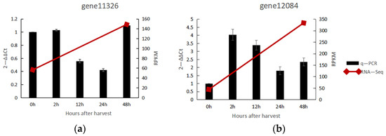 Two unigenes (gene number: gene 11,326 and gene 12,084) were annotated as CCoAOMT in the full-length sequence obtained by Iso-Seq. The expression of these two genes in the two days after the natural ripening of noni fruit was verified by q-PCR, and the results are shown in Figure 6. Their expression results are consistent with the RNA-Seq, showing average up-regulated expression, with gene 12,084 showing relatively high up-regulated expression, 4-fold at the 2 h after harvest.