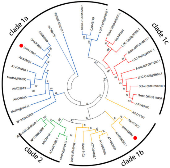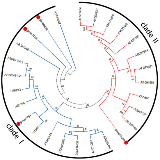 The result of phylogenetic relationships (Figure 7) indicates that the CCoAOMTs could be classified into four clades (1a, 1b, 1c, and 2). Gene 11,326 was grouped in clade 1a, and gene 12,084 was grouped in clade 1b. The result of phylogenetic relationships (Figure 8) indicates that the COMTs could be classified into two clades (clade I and clade II). Gene 10,983 was grouped in clade II, and gene 7446, gene 8422, and gene 6794 were grouped in clade I.