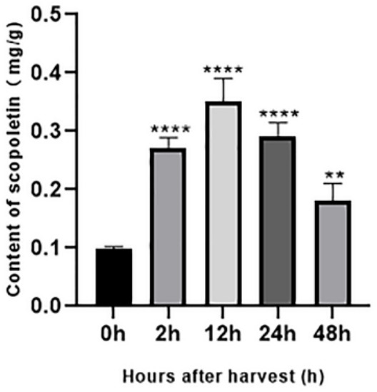 Change in the content of scopoletin in noni fruit within 48 h after harvest. Data are presented as the mean ± S.D. of three individual experiments, performed in triplicate. p values of less than 0.05 were considered significant. Note: ** indicates p less than 0.01 and **** indicates p less than 0.0001.