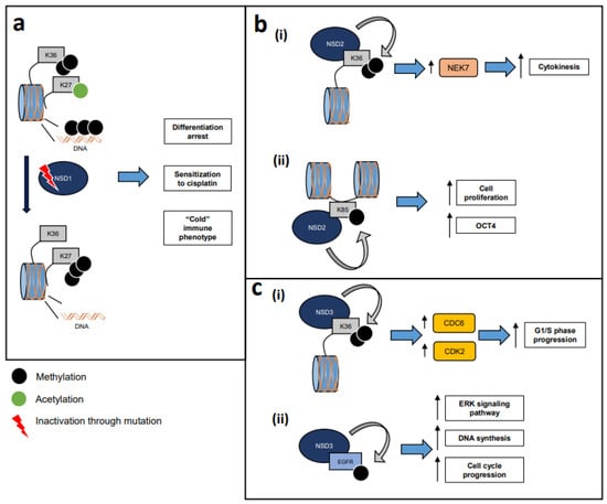 Reported mechanisms of action of the NSDs in HPV-negative HNSCC. (a) Inactivating mutations of NSD1 in HPV-negative HNSCC induce decreased levels of H3K36me2, global DNA hypomethylation and increased levels of H3K27me3, leading to differentiation arrest, increased sensitivity to cisplatin, and a “cold” immune phenotype. (b) NSD2 in HNSCC. (i) NSD2 dimethylates H3K36, leading to NIMA-related kinase 7 (NEK7) upregulation to promote cytokinesis. (ii) NSD2 monomethylates H1K85, promoting pathways related to cell proliferation and upregulating OCT4, a stemness factor. (c) NSD3 in HNSCC. (i) NSD3 dimethylates H3K36, leading to CDC6 and CDK2 upregulation and promotion of G1-S phase progression. (ii) NSD3 methylates epidermal growth factor receptor (EGFR) at lysine 721, increasing interaction with PCNA to enhance DNA synthesis and promote cell cycle progression.