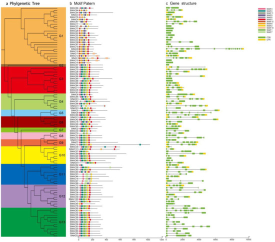 Figure 2. Phylogenetic tree, conserved motifs, and gene structures of the SlNAC genes. (a) Phylogenetic tree constructed using MEGA software version 5.05 with 1000 bootstrap replicates based on 101 SlNAC protein full-length sequences (G1–G13 indicate 13 clades). (b) The motif compositions of the SlNACs were identified using the Multiple Expectation Maximization for Motif Elicitation (MEME) program. A total of 12 motifs were predicted and the different motifs are indicated in different colors. (c) The gene structures of the SlNACs were visualized using TBtools software version 1.098769. The green boxes represent CDs, the yellow boxes represent UTR, and the black lines represent introns.