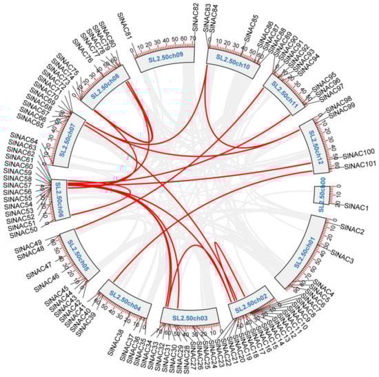 Figure 3. Chromosomal distribution and collinear relationships of the SlNAC genes. The duplicated gene pairs are joined by red lines.