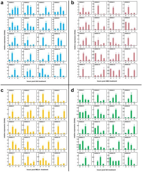 Figure 7. Expression levels of SSlNAC1–20 under different phytohormone treatments at different times (3, 6, and 12 h): (a) IAA (indole-3-acetic acid) treatment; (b) ABA (abscisic acid) treatment; (c) MEJA (methyl jasmonic acid) treatment; (d) SA (salicylic acid) treatment. The 2−ΔΔCt method was used to calculate the expression fold for each SSlNAC gene. Data are the mean ± standard errors (SD) from three independent biological replicates. Error bars indicate the standard error. An asterisk (*) represents a significant difference (* p < 0.05, ** p < 0.01).