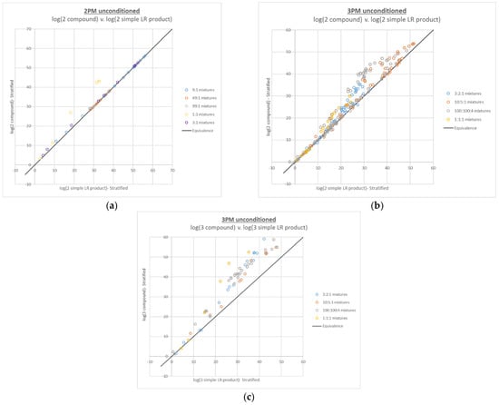 Plots of log(compound LR) v. corresponding log(simple LR product) for (a) 2-person mixtures with 2 true contributors, (b) 3-person mixtures with 2 true contributors, and (c) 3-person mixtures with 3 true contributors.