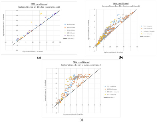 Plots of 2- and 3-person log(LR)s based on conditioned interpretations v. corresponding log(LR)s based on unconditioned interpretations: (a) 2-person mixtures conditioned on 1 true contributor, (b) 3-person mixtures conditioned on 1 true contributor, and (c) 3-person mixtures conditioned on 2 true contributors.