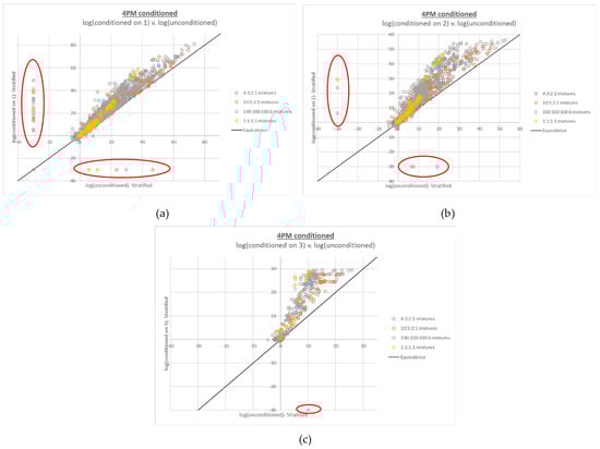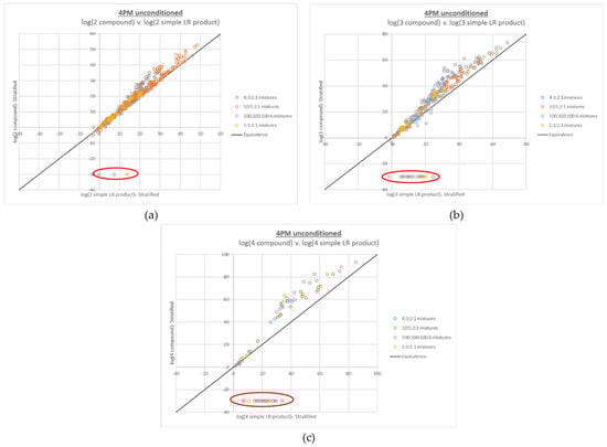 Plots of log(compound LR) v. corresponding log(simple LR product) for 4-person mixtures, with (a) 2 true contributors, (b) 3 true contributors, and (c) 4 true contributors in the numerator proposition. Increasing numbers of false negative compound LRs (LRs of 0, plotted at −30 and circled in red) were observed with increasing numbers of true contributors in the LR numerator. Approximately 0.7% of the data points in (a), 7.4% of the data points in (b), and 31% of the data points in (c) are false negative LRs.