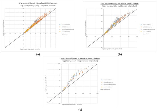 Four-person compound LR plots from Figure 3, recalculated based on interpretations run at 20x MCMC accepts, with: (a) 2 true contributors, (b) 3 true contributors, and (c) 4 true contributors in the numerator propositions.