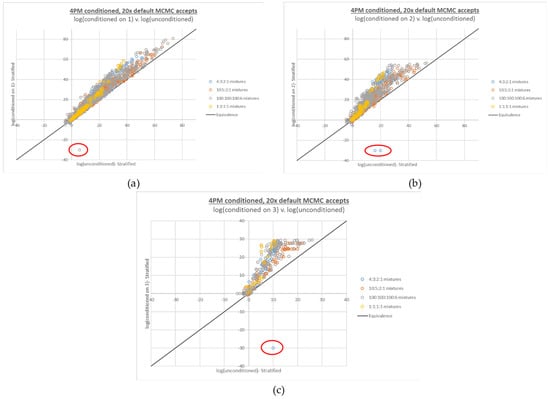 Plots of 4-person log(LR)s based on conditioned interpretations v. corresponding log(LR)s based on unconditioned interpretations run at the default number of MCMC accepts. The number of conditioned true contributors are (a) 1, (b) 2, and (c) 3. False negative LRs (LRs of 0, plotted at −30 and circled in red) are observed along both the X and Y axes for all but the interpretations conditioned on three true contributors (c).