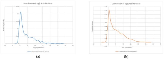 Furthermore, in a similar fashion to the compound/LR product plots, the conditioned/unconditioned LR plots show that conditioning does not always lead to a higher LR. The distribution of log(LR) differences between conditioned LRs and their corresponding unconditioned counterparts ranged from a minimum of ~−3.2 to a maximum of ~27.7, with the probability density again peaking at approximately 0.5 (see Figure 7b).