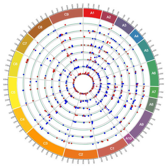 The distribution and size of CNV events in RGAs (red and blue dots represents deletions and duplications, respectively) across the chromosomes of eight winter type and blackleg resistant B. napus cultivars. The tracks from outer to inner show chromosomes, Ascona, English Giant, Hansen × Gaspard, Milena, Pacific, Pirola, Tina and Wilhelmsburger. The green line shows the 1000 bp threshold. Ax and Cx in the outer coloured boxes are presenting chromosomes number.