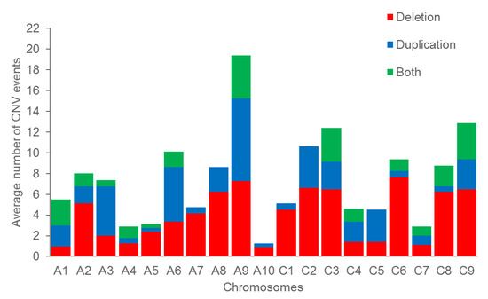 The average number of CNV events per chromosome ranged from 19.37 on chromosome A09 to 1.25 on chromosome A10 (Figure 4 and Table S1). In cases where both deletion and duplication events were observed, the largest deletion and duplication percentages (in relation to the total number of CNV events on each chromosome) were found on chromosomes C08 (30 deletions out of 31 CNVs; 96.77%) and A03 (12 duplications out of 14 CNVs; 85.71%) in the cultivars Tina and Pirola, respectively (Figure 4 and Table S1).