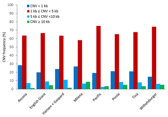 Out of the 1,137 CNV events, 905 CNVs (79.59%) were found to be larger than 1 kb (Table S2). The average size of the CNVs identified varied from 1.91 kb in Ascona to 4.90 kb in Milena, with an average size of 3.29 kb across the eight cultivars (Table S2). In all the cultivars, except for Hansen x Gaspard, deletions were larger than duplications (Table S2 and Figure 2). The size distributions of observed CNVs were also very similar between the eight cultivars. Only Milena and Pacific had more CNVs larger than10 kb than CNVs smaller than 10 kb but larger than 5 kb (Figure 2 and Figure 5).