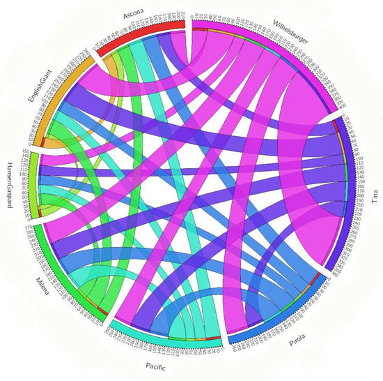 Circos plots showing the number of RGAs with the same CNV events among eight winter type and blackleg resistant B. napus cultivars. Each ribbon shows number of RGAs with CNV in common, the wider ribbon, the highest number of RGAs with the same CNV.