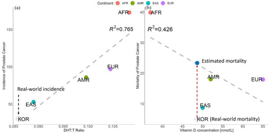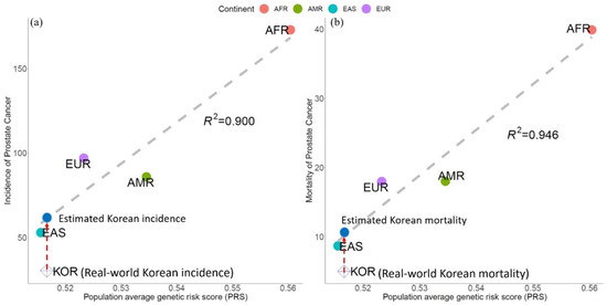 - Vieira, G.M.; Gellen, L.P.A.; Leal, D.F.D.V.B.; Pastana, L.F.; Vinagre, L.W.M.S.; Aquino, V.T.; Fernandes, M.R.; de Assumpção, P.P.; Burbano, R.M.R.; dos Santos, S.E.B.; et al. Correlation between Genomic Variants and Worldwide Epidemiology of Prostate Cancer. Genes 2022, 13, 1039. [Google Scholar] [CrossRef]