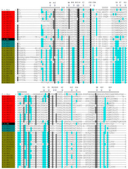 The MSA shows a high quality alignment confirmed by the conservation of the invariant proximal histidine at position F8 (His-F8), the highly conserved phenylalanine at position CD1 (Phe-CD1), and the phenylalanine at position B14 (Phe-B14) (Figure 2). A tryptophan at position H8 replaces the methionine found in sperm whale myoglobin. This is an amino acid replacement found in invertebrate Hbs [7,49]. The conservation of key positions in hemoglobins can be explained by the previous work of Ptitsyn and Ting [50] with the analysis of sequences from twelve globin subfamilies. In this analysis, Ptitsyn and co-workers showed that there are two common conserved clusters of amino acids between these globins. The first cluster includes residues in direct contact with the heme (CD1, F8, E11, FG5, F4, and G5), and heme neighboring residues (C2, B14, B10, E4, CD4, H19 and B13). The second cluster incudes hydrophobic residues distant from the heme center that may play an important role in the first steps of the protein folding process (A8, A12, G12, G16, H8 and H12) [50]. Additionally, the work of Liong et al. [51] with sperm whale myoglobin showed the relevance of residues at positions F4, FG3, FG5, and G5, in retaining the porphyrin prosthetic group. They demonstrated that the residues in positions Leu-F4, His-FG3, Ile-FG5, and Leu-G5 create a hydrophobic environment around the porphyrin preventing hydration of the heme. In our analysis, positions A12, B6, B13, B14, E4, FG5 and H8 show a high level of conservation (100% or >80% conservation level) presenting either the same residue or residues with the same physicochemical properties. The positions A8, B10, C2, CD4, E11, F4, G5, G12, G16, H12 and H19 have lower conservation (>50% conservation level), or no conservation among the sequences.