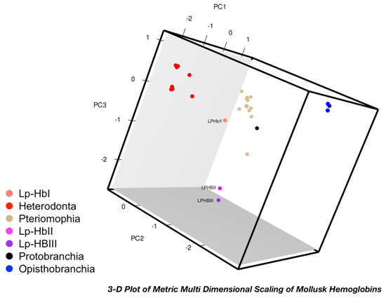This type of analysis is a powerful method used to visualize distance between sequences and complements phylogeny providing evolutionary information [46]. This sequence space is defined by the principal components (PCs). In Figure 5 we show the 3-D projection of the first three PCs. It is highly informative about the evolution and drift of these proteins. In this analysis we observed, as expected, that these globins are also clustered according to their subfamilies. However, the 3D sequence space clearly shows how HbIILp and HbIIILp are close to each other and separated from the other members of the Heterodonta subfamily. On the other hand, HbILp is closer to other members of the Heterodonta subfamily despite its unique hydrogen sulfide reactivity. This data shows that HbIILp and HbIIILp have drifted evolutionarily in the sequence space. The 2D projections for pairs of these three PC are also shown in Supplementary Figure S2 as B, C and D. In this analysis we observed, as expected, that these globins are also clustered according to their subfamilies. The 2D sequence space of PC1 and PC2, Figure S2B, resembles the unrooted phylogenetic tree previously shown. However, the 3D sequence space clearly shows how HbIILp and HbIIILp are close to each other and separated from the other members of the Heterodonta subfamily. This can also be seen in the other two 2D sequence space shown in Figure S2C,D. These results revealed that even though HbIILp and HbIIILp are O2 transporting Hbs like the ones found in the Calyptogena spp., they are evolving independently as an outgroup while the HbILp sequence conserves a higher degree of evolutionary similarity to the Calyptogena spp. Hemoglobins.