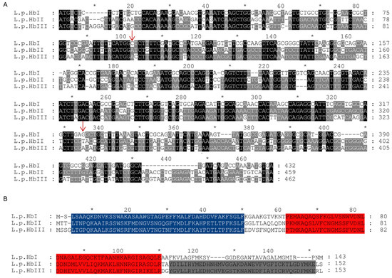 The level of conservation between the three coding region sequences of HbILp, HbIILp and HbIIILp of L. pectinata is presented in the multiple sequence alignment in Figure 6A.