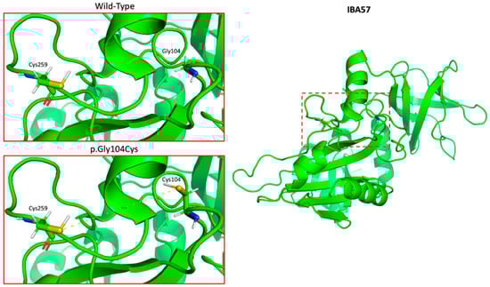 The crystal structure of human IBA57 has been previously elucidated and is available on the RCSB protein databank (https://www.rcsb.org/structure/6QE3, accessed on 1 August 2022) [,,]. We used PyMOL to visualize the impact of the variant on the IBA57 protein structure.