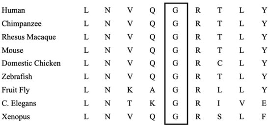 We used the UCSC genome browser tool (https://genome.ucsc.edu/, accessed on 1 August 2022) comparative genomics conservation track to obtain sequences of IBA57 homologs in the region of the variant across species.