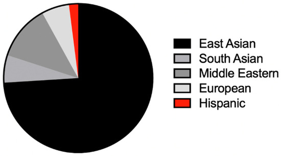 Pie chart depicting proportion of affected patients across major ethnic groups (N = 50). East Asian (Chinese (n = 32), Japanese (n = 5)), South Asian (Indian (n = 3)), Middle Eastern (Moroccan (n = 3), Sephardic Jewish (n = 2), Tunisian (n = 1)), European (Italian (n = 3)), and Hispanic (Cuban (n = 1)).