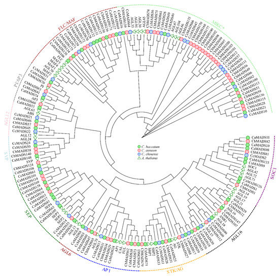 A phylogenetic tree was reconstructed using 105 AtMADS-box and 453 pepper MADS-box genes to further study the phylogenetic relationships of MADS-box genes. Following the classification and structure of the A. thaliana MADS-box family, we reconstructed two separate phylogenetic trees of type I (Figure S1) and type II (Figure 1) genes, respectively. The results showed that type I MADS-box genes were divided into three subfamilies (Mα, Mβ, and Mγ). There were 99, 6, and 16 members of Mα, Mβ, and Mγ, respectively, in C. annuum; 134, 8, and 7 members, respectively, in C. baccatum; and 34, 3, and 6 members, respectively, in C. chinense (Figure S1). The Mα subfamily in C. baccatum was considerably expanded, while the Mβ subfamily in C. chinense was substantially contracted. Type II MADS-box genes were further divided into 10 subfamilies: SEP, AGL16, AP1, STK/AG, AGL12, SCO1, SVP, PI/AP3, FLC/MAF, and MIKC*. The “ABCDE” genes of flower development, such as SEP, AP1, AG, PI, AP3, and STK, were amplified among the type II genes of the three pepper species (Figure 1, Table S2).