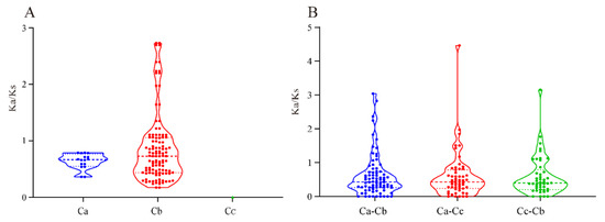 Selection pressure statistics of paralogous (A) and orthologous (B) MADS-box genes in pepper. Ca, C. annuum; Cb, C. baccatum; Cc, C. chinense. The ‘dots’ reflect the maximum and minimum Ka/Ks scores.
