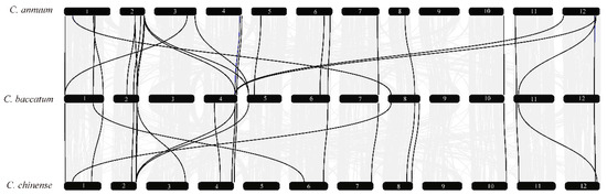 To study the contraction and expansion of type II MADS-box family members during evolution, the phylogenetic relationships among MIKC MADS-box genes in the three pepper species were explored using collinearity analysis. The results revealed 33 pairs of colinear genes between C. annuum and C. baccatum, and 18 pairs of colinear genes between C. baccatum and C. chinense (Figure 5, Table S8). Most type II genes were located at both ends of chromosomes, such as CaMADS8 on chromosome 1 and CbMADS80 on chromosome 8. In addition, the homologous genes on chromosomes 1, 2, 11, and 12 of C. annuum were distributed on chromosomes 4 and 5 of C. baccatum; the type II homologous genes on chromosomes 1 and 2 of C. annuum were located on chromosomes 6 and 3 of C. chinense. In C. baccatum, the type II homologous genes of chromosomes 1, 5, and 8 were distributed on chromosomes 1, 2, and 6 of C. chinense. There was no type II MADS-box gene on chromosome 9 in the three Capsicum species, which may be related to interchromosome 9 translocations [34]. In summary, most of the type II MADS-box genes in the three peppers showed conserved collinearity among chromosomal regions, but there was also deviation in duplicated gene pairs.