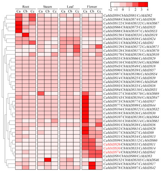 We next analyzed the expression profiles of the MADS-box genes in root, stem, leaf, and flower tissues using RNA-seq data for the three peppers. The results showed that the expression of MADS-box genes in 73 groups of orthologous genes was considerably different among the three pepper species in the four tissues (Figure 6). Comprehensive analysis revealed that their expression patterns could mainly divide the genes into three categories: (1) genes expressed in all four tissues, such as CaMADS93/CbMADS35/CcMADS58, CaMADS82/CbMADS198/CcMADS4, and CaMADS116/CbMADS134/CcMADS66, indicating that they are widely involved in the growth and development of pepper; (2) genes with high expression during flower development, such as CaMADS26/CbMADS31/CcMADS11, CaMADS30/CbMADS33/CcMADS14, and CaMADS74/CbMADS83/CcMADS41, belonging to type II, suggesting that they play important roles in flower development; and (3) genes with high expression in roots, such as CaMADS9/CbMADS81/CcMADS2 and CaMADS68/CbMADS74/CcMADS36, indicating that these genes may be involved in root development and some physiological and biochemical processes in underground plant part. In addition to the three distinct expression patterns, most of the orthologous genes showed the same expression trend in the three pepper species, but some homologous genes displayed different expressions in the same tissue. For example, CcMADS69 was not expressed in any tissues, while its homologous gene CaMADS127 was highly expressed not only in flowers, but also in stems, indicating that orthologous genes in pepper may have gained or lost functions in the process of evolution.