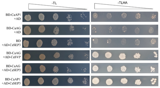 Yeast two-hybrid assays of interactions among CaAP1, CaAG, CaSVP, and CaSEP3 proteins.