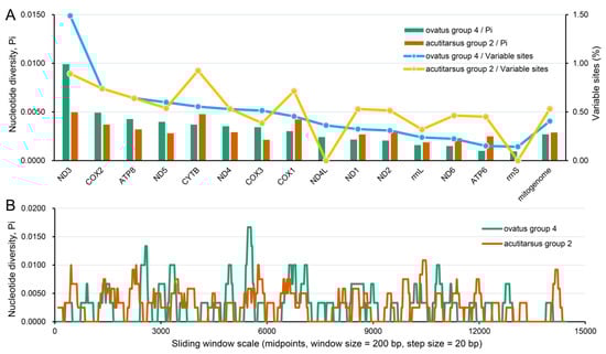 Our six newly determined mitogenomes were grouped into the I. ovatus group 4 and I. acutitarsus group 2 (Table 1 and Table 2), respectively. For these two species groups, we calculated the nucleotide variable site percentage and the nucleotide diversity level. At the mitochondrial genome-wide level, the nucleotide variable site percentage and the nucleotide diversity level of I. ovatus group 4 were 0.41% and 0.0027, respectively, which were slightly lower than the corresponding values of I. acutitarsus group 2 (0.53% and 0.0029) (Figure 2A). Sliding window analysis of the mitogenomes showed a similar nucleotide diversity result between these two groups (Figure 2B). As shown in Figure 2A, at the mitochondrial single-gene level of these two species groups, ND3 had the highest and rrnS had the lowest nucleotide variable site proportion, and the same situation also appeared at the nucleotide diversity level. Very low nucleotide diversity in rrnS was also found among nine Ixodes species [71].