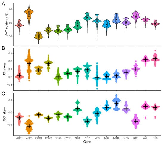 We also counted the nucleotide composition of individual genes in these 357 Ixodidae mitogenomes. At the mitochondrial single-gene level (including 13 PCGs and two rRNAs), A + T content of Ixodidae species ranged from 70.31% (COX1) to 86.47% (ATP8), which was much larger than the G + C content (Figure 4A); AT-skews ranged from −0.209 (ND3) to 0.034 (rrnS) (Figure 4B); GC-skews ranged from −0.562 (ATP8) to 0.375 (ND4L) (Figure 4C); ND1, ND4, ND4L, ND5, rrnL, and rrnS genes transcribed by the light chain had higher GC-skew values than those genes transcribed by the heavy chain, while only rrnL and rrnS had higher AT-skews than other genes (Figure S2).