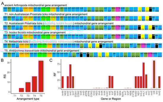 In this study, we summarized five different gene arrangement types based on the comparison of all available Ixodidae complete mitogenomes to date (Figure 6A). The gene arrangement types T1, T2, and T3 were discovered in Prostriata ticks, while T4 and T5 were found in Metastriata ticks (Figure 7). Type T1 was identical to the ancient Arthropoda gene arrangement type found in Limulus polyphemus [58], which was assumed to be the ancestral type of arthropods and also found in Liphistiidae spiders [24,34], Nuttalliellidae ticks [104,105], and Argasidae ticks [59,104]. The non-Australasian Prostriata ticks had type T1, and almost all Australasian Prostriata ticks had type T2, except that I. fecialis owned type T3; Type T4 was the most common type, occurring in almost all Metastriata ticks, whereas type T5 only occurred in Am. transversale (now named Af. transversale). Among the five gene arrangement types, there were three types of gene position changes: duplication of CR, inversion of trnC and trnP, shuffling of many genes, and translocation of many genes. Compared to the ancient Arthropoda gene arrangement type, type T5 had the highest RS value (Figure 6B), indicating that it undergone the most complex changes. Furthermore, the RF value of 14 mitochondrial genes was only 0 (Figure 6C), indicating that their adjacent genes were not rearranged. The highest RF value was assigned to CR, followed by trnL1 and trnC. We identified that the segment trnY-COX1-trnS1-COX2-trnK-ATP8-ATP6-COX3-trnG was the most conservative region, while the region near CR was the rearrangement hot spot in Ixodidae mitogenomes.