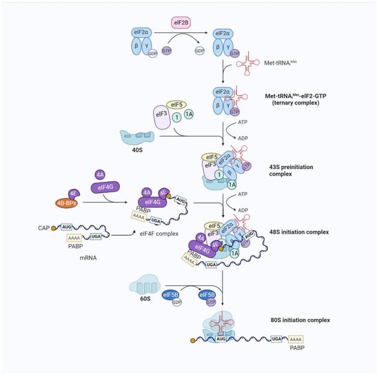 Translation is an essential step in the regulation of gene expression. Cells consume a large amount of energy in the process of mRNA translation and protein synthesis [1]. In eukaryotes, translation initiation is a complex and highly regulated process, and this regulation is necessary for many important life processes, requiring the participation of at least a dozen protein factors [2]. At the same time, eukaryotic initiation factors (eIFs) regulate the translation of mRNA, which is crucial for gene expression. This regulation primarily occurs at the initiation stage of eukaryotic translation, which is the rate-limiting step of protein synthesis. The dysregulation of mRNA translation is a collective characteristic of tumorigenesis, and aberrant changes in the components of the translational machinery are also frequently found in cancer. For instance, the atypical behavior of the eIF complex activated by upstream signaling pathways has been detected in non-cancer-related human diseases and numerous tumors, resulting in the selective expression of the encoded proteins associated with tumorigenesis, metastasis, or anti-tumor drug resistance [3,4]. The translational regulation of pre-existing mRNA is more direct, faster, and more powerful than transcriptional regulation. It sensitively alters the levels of encoded proteins in cells, thereby changing the expression of the proteome rapidly without requiring alterations in RNA synthesis to allow cells to adapt to physiological and pathological conditions. The translation of eukaryotic genes is a very complex and precise process. The four main stages include initiation, elongation, termination, and the recycling of ribosomes [5].