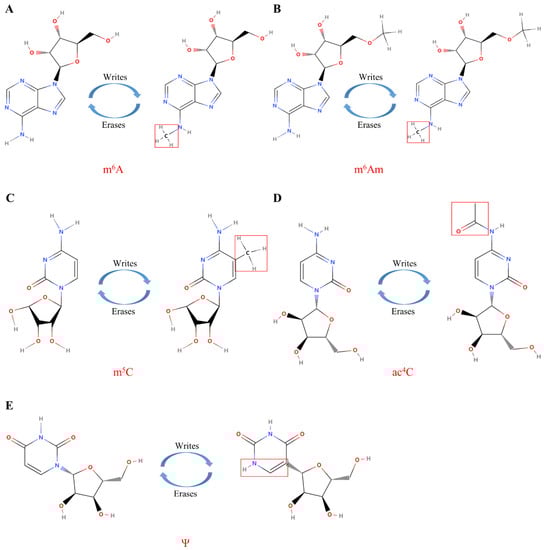 The molecular composition of RNA modifications. (A) The m6A modification of RNA is mediated by proteins called “writes” and “erases”; (B) The m6Am modification of RNA is mediated by proteins called “writes” and “erases”; (C) The m5C modification of RNA is mediated by proteins called “writes” and “erases”; (D) The ac4C modification of RNA is mediated by proteins called “writes” and “erases”; (E) The Ψ modification of RNA is mediated by proteins called “writes” and “erases”. Under the catalysis of the corresponding enzymes, the molecular structure and the enrichment level of RNA are changed to play different biological roles.
