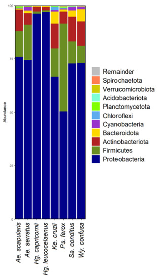 Bacteria of the Proteobacteria phylum showed the greatest number of sequences in all species (Figure S5). Figure 4 shows that a larger number of Wolbachia sequences was found in Hg. leucocelaenus, whereas Afipia was more abundant in Ke. cruzii, Sa. conditus and Wy. confusa.