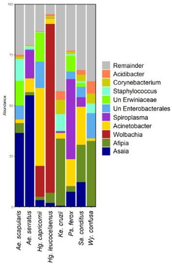In the ANCOM analysis, it was possible to verify that Wolbachia was more abundant in Hg. leucocelaenus, while Afipia and Asaia genera were more abundant in Ke. cruzii and Ae. serratus, respectively (Table S5 and Figure S4).