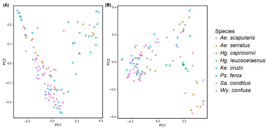 Principal Coordinate Analysis (PCoA) plots β diversity differences between the mosquito species. (A) PCoA using unweighted distance data. (B) PCoA using weighted distance data.