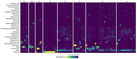 Heatmap of bacterial sequences with taxonomic assignment to genus level in each mosquito sample. Each row represents a bacterial taxon and each column corresponds a mosquito sample. Relative abundance data are assigned colors across a gradient from yellow (higher bacterial abundance) to purple (lowest bacterial abundance). (A) corresponds to samples of the species Ae. scapularis; (B) corresponds to samples of the species Ae. serratus; (C) corresponds to samples of the species Hg. capricornii; (D) corresponds to samples of the species Hg. leucocelaenus; (E) corresponds to samples of the species Ke. cruzii; (F) corresponds to samples of the species Ps. ferox; (G) corresponds to samples of the species Sa. conditus and (H) corresponds to samples of the species Wy. confusa.