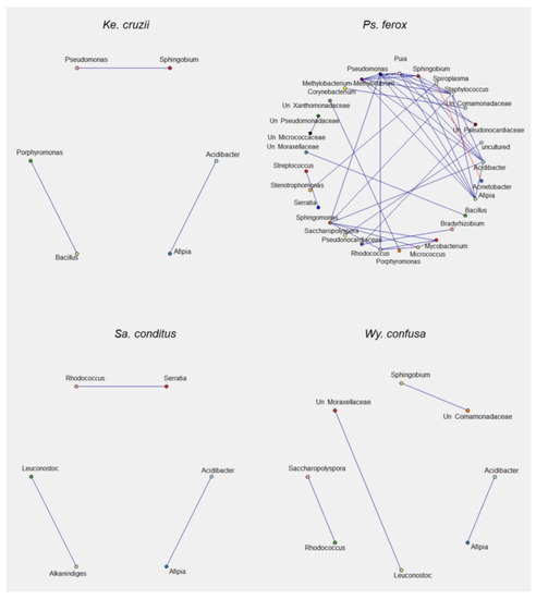 Bacterial interaction network in Ke. cruzii, Ps. ferox, Sa. conditus and Wy. confusa. Each colored circle represents a bacterial taxon. Blue line corresponds to positive correlation between taxa. Red line represents negative correlation between taxa. Correlations were obtained by Spearman and only considered correlations with r > 0.75 and p > 0.05.