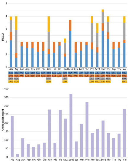 Relative synonymous codon usage (RSCU) and amino acids count of E. rumphii mitochondrial genome.