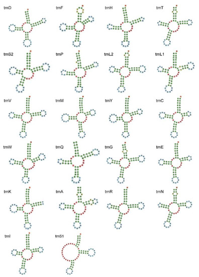 The size of 22 transfer RNA genes ranged from 64 (tRNA-Cys) to 70 bp (tRNA-Gly). The AT content of total tRNAs was 62.6%, also showing an AT bias. Almost all tRNAs of E. rumphii had typical clover-leaf secondary structures with four arms, except for trnS1 (Figure 3). This phenomenon where this specific tRNA does not form a four-arms clover-leaf structure can be observed in most metazoan mitogenomes [25].